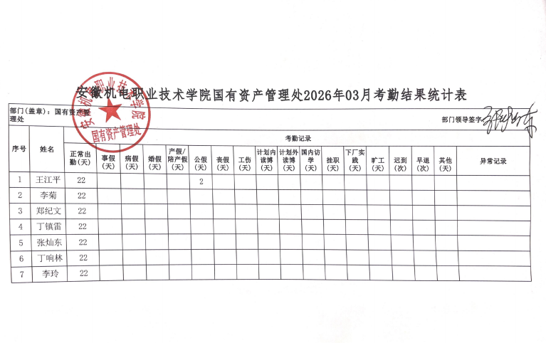 国有资产管理处2026年3月份考勤结果公示